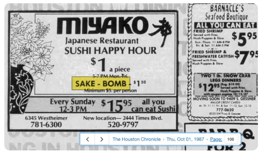 that you can find newspaper clippings from 1987 in another state if you try hard enough and if your target is sake bombs apparently, which is amazing. And I’m super happy that you did this. I